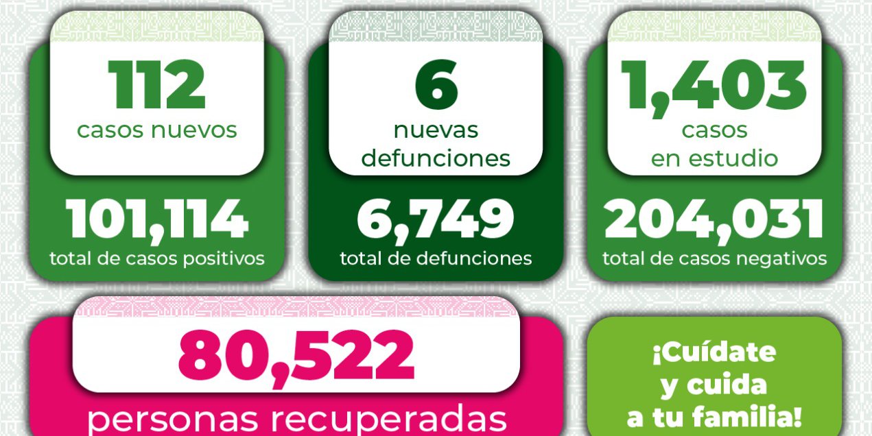 En cuanto a decesos, se reportan 6 nuevos para un total de 6 mil 749 muertes. De estas defunciones, 2 corresponde a mujeres y 4 en hombres de 34 a 74 años de edad.