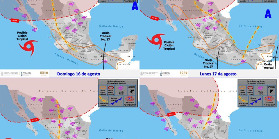 Finalmente, durante el periodo de pronóstico, la onda tropical No. 27 que recorrerá el sur y occidente del territorio nacional, canales de baja presión sobre el occidente y sureste del país, aire inestable en niveles altos de la atmósfera, una nueva onda tropical que ingresará al sureste de la República Mexicana y una baja presión con potencial de desarrollo ciclónico al sur de las costas de Oaxaca y Chiapas, ocasionarán lluvias, rachas de viento, descargas eléctricas y posibles granizadas sobre los estados del noroeste, norte, occidente, centro, oriente, sur y sureste del país, incluido el Valle de México.