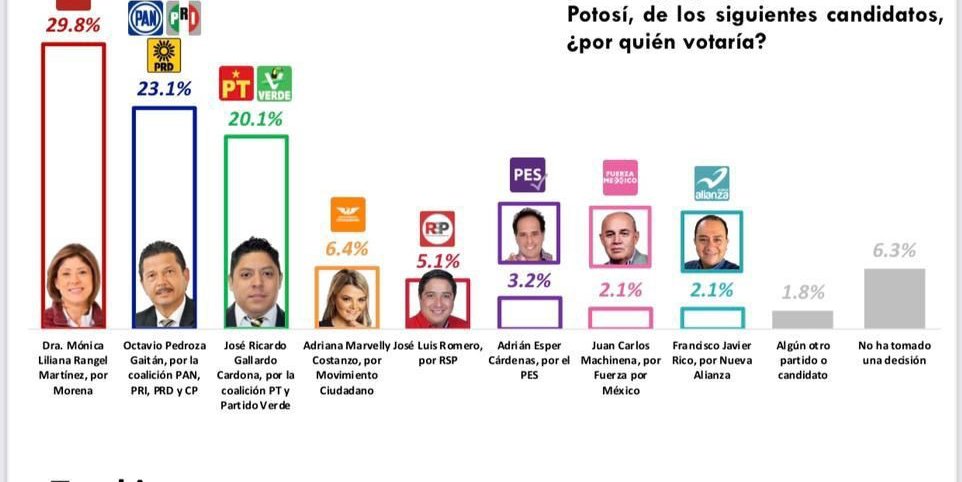 Esta casa encuestadora le da un 29.8 por ciento, pero esa misma empresa hace poco más de un mes la colocaba en segundo lugar, y ahora quien tiene esa posición es el candidato de la coalición PRI-PAN-PRD y CP, con el 23.1 por ciento.