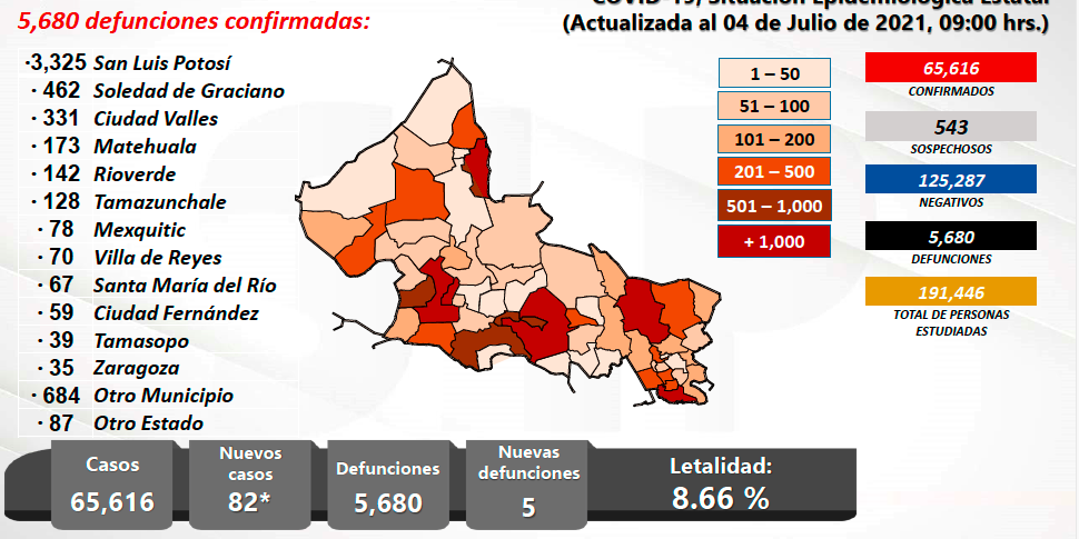 Este día se presentaron 82 nuevos casos para llegar a 65 mil 616 confirmados de 191 mil 446 personas estudiadas; se han descartado 125 mil 287 personas y la cifra de pendientes de estudio es de 543 sospechosos. Los decesos subieron a 5 mil 680 con un índice de letalidad que se ubica en 8.66% decesos por cada 100 casos.
