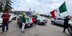 Ya en el Centro, un grupo se bajó de los vehículos y se mantuvo con pancartas y banderas frente al Sistema de Administración Tributaria (SAT), mientras el resto del contingente realizó un carrusel por algunas calles del primer cuadro de la ciudad.