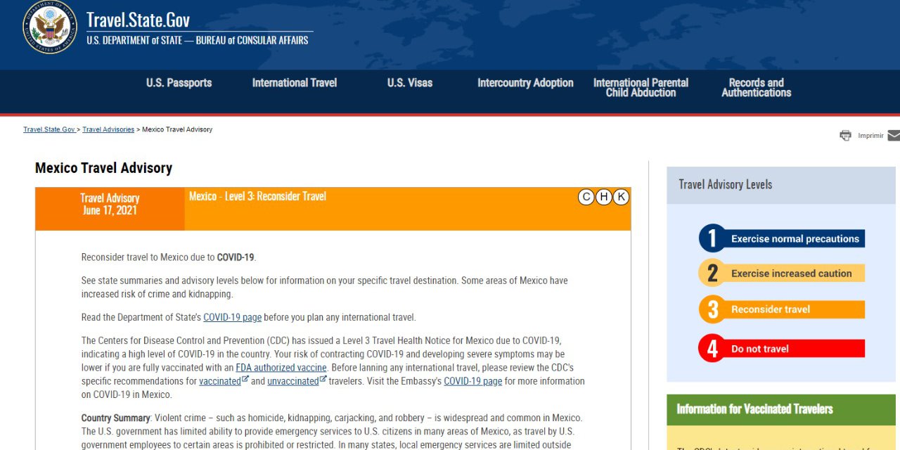 Cabe recordar que todos los destinos internacionales habían sido evaluados como Nivel 4 (rojo) al comienzo de la pandemia en marzo 2020 debido a la contingencia sanitaria Covid-19, pero el Departamento de Estado ha ido levantando esa advertencia.