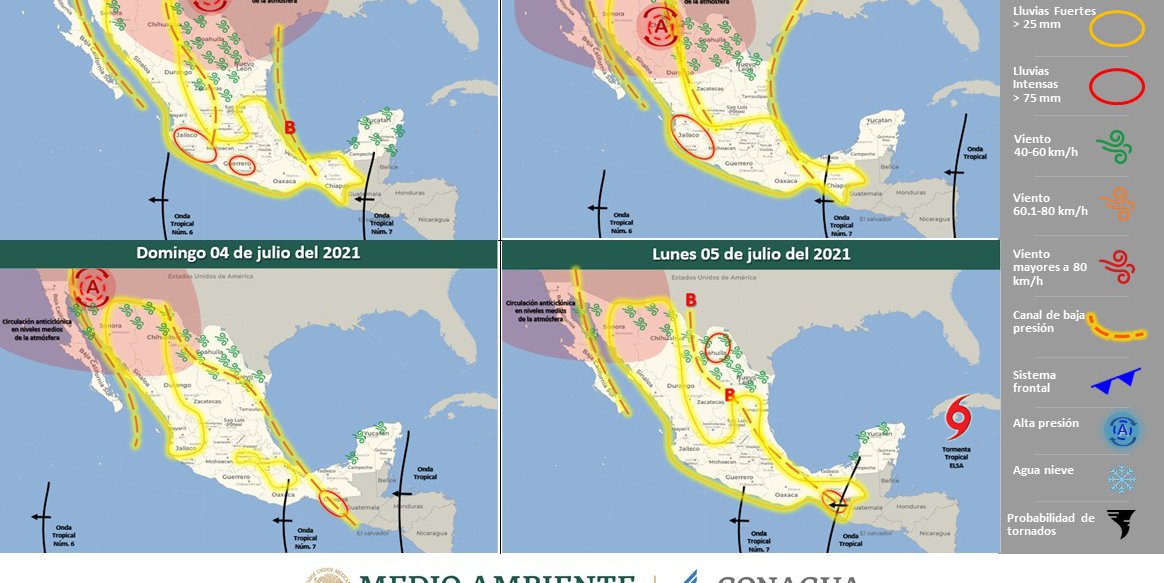 Por otra parte, la onda tropical Núm. 6 se ubicará frente a las costas del occidente de México, en combinación con un canal de baja presión el cual se extenderá desde el noroeste hasta el centro del país y con la entrada de humedad proveniente del Océano Pacífico, originarán lluvias fuertes a muy fuertes con descargas eléctricas y posible caída de granizo en el noroeste, norte, occidente, centro y sur del país, incluido el Valle de México, llegando a registrarse lluvias puntuales intensas en Jalisco, Colima, Michoacán y Guerrero.