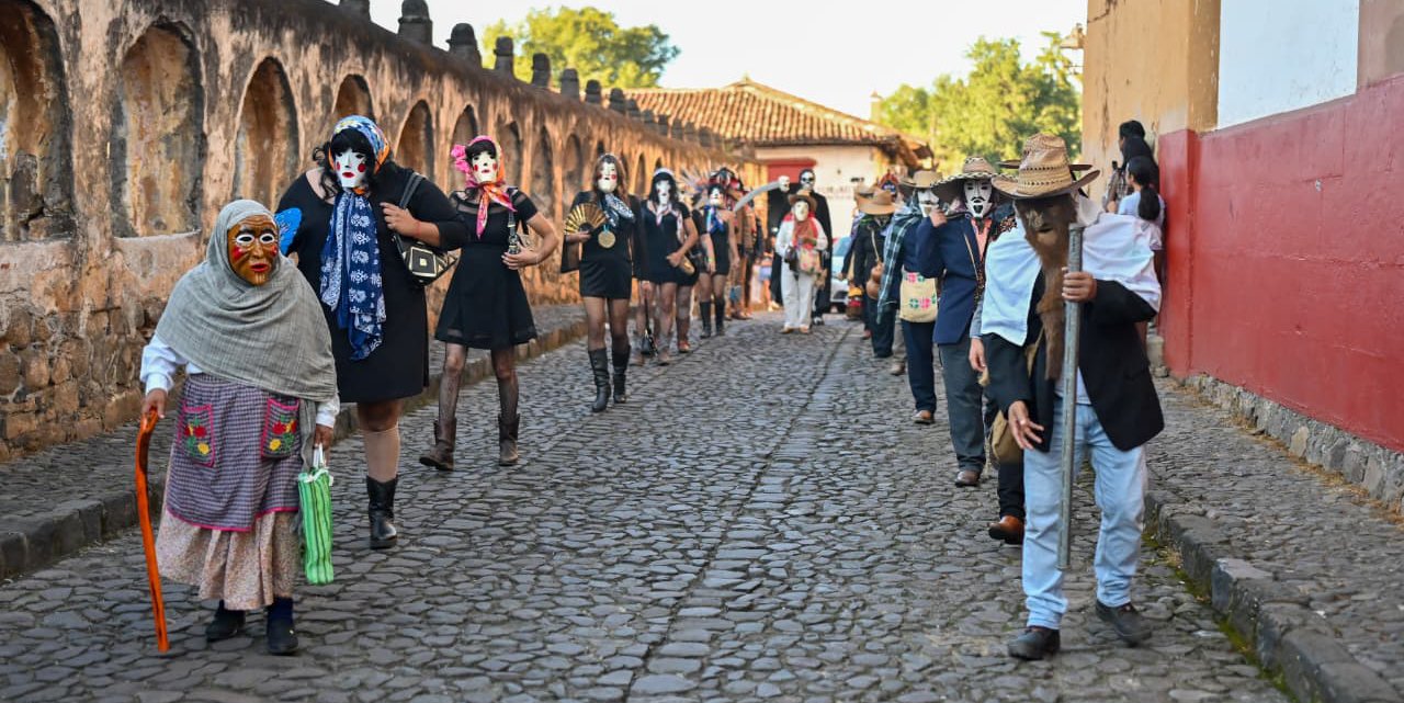 Desde el Centro Cultural Antiguo Colegio Jesuita hasta la presidencia municipal de Pátzcuaro, un vibrante desfile tomó vida con la participación de comparsas tradicionales provenientes de distintos municipios potosinos. Danzas, máscaras, atuendos típicos y música de viento transformaron el espacio público en una expresión viva del respeto a los que ya no están, pero también en una celebración de la vida misma.