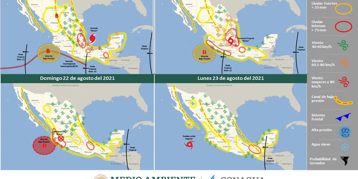 Durante el sábado el ciclón tropical Grace, recorrerá el centro del país debilitándose gradualmente, se pronostica que interactúe con la Onda Tropical No. 22, la cual recorrerá el occidente del territorio nacional y una zona de baja presión con probabilidad para desarrollo ciclónico frente a las costas de Colima y Jalisco, ocasionarán lluvias fuertes a puntuales intensas sobre entidades del oriente, centro, occidente y sur de México, con lluvias puntuales torrenciales en Guerrero y Michoacán.