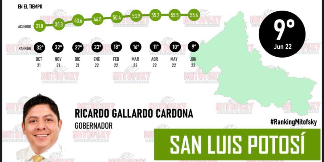 El ranking de Consulta Mitofsky “Gobernadores y Gobernadoras de México”, ubicó a Ricardo Gallardo Cardona, mandatario estatal de San Luis Potosí, en el top diez de quienes detentan los niveles más altos de aprobación ciudadana y es el que más rápido ha escalado en el listado, pues en sólo nueve meses pasó del lugar 32 al noveno.