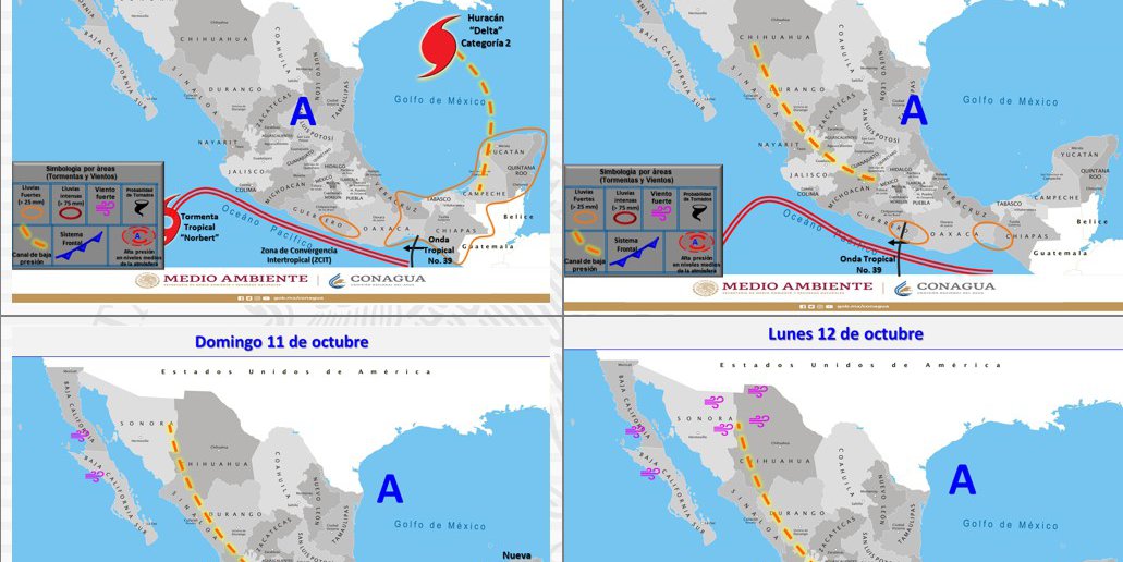 Para hoy viernes, se pronostica que, la onda tropical No. 39 se desplace lentamente sobre el sur del país, en interacción con la entrada de humedad del Océano Pacífico, mantendrá el potencial de lluvias fuertes a muy fuertes en el sur y sureste del territorio nacional. Canal de baja presión sobre la Península de Yucatán y entrada de humedad del Golfo de México, generarán lluvias fuertes a muy fuertes con descargas eléctricas en Tabasco y la Península de Yucatán. Por otra parte, el huracán Delta ha dejado de afectar al país.