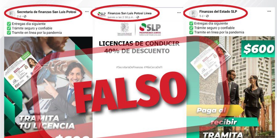 Las páginas y perfiles falsos se denominan: “Secretaría de finanzas San Luis Potosí”, “Finanzas San Luis Potosí Línea” y “Finanzas del Estado SLP”. Mediante estas redes falsas hacen circular imágenes en donde ofrecen licencias de conducir a un costo de 600 pesos y señalan que el trámite se realiza en línea.