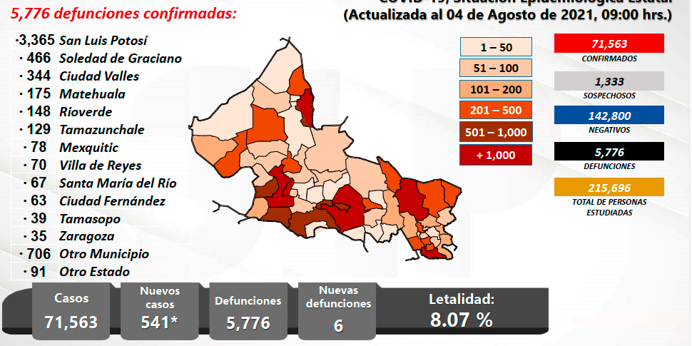 Se reportaron 541 nuevos casos para llegar a 71 mil 563 confirmados de 215 mil 696 personas estudiadas; se han descartado 142 mil 800 personas y la cifra de pendientes de estudio es de 1 mil 133 sospechosos. Los decesos subieron a 5 mil 776 con un índice de letalidad que se ubicó en 8.07% decesos por cada 100 casos (nacional 8.36).
