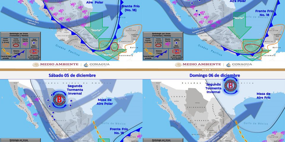 Finalmente, durante el periodo de pronóstico, el intenso frente frío No. 18 se extenderá sobre el sureste del país y la Península de Yucatán. Mientras que la segunda tormenta invernal se desplazará hacia Texas, EUA, alejándose del territorio nacional.