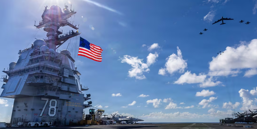 Estados Unidos divulgó las primeras imágenes del portaaviones USS Gerald R. Ford en el Atlántico junto a un bombardero B-52, aviones de guerra y la flota de buques que lo escoltan.
