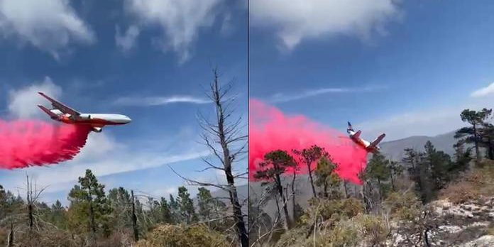 La aeronave DC-10 realizó este lunes las primeras descargas de agua con retardante para combatir el incendio en la sierra de Arteaga, en Coahuila así como en Nuevo León, donde se espera que haga lo mismo en el municipio de Linares.