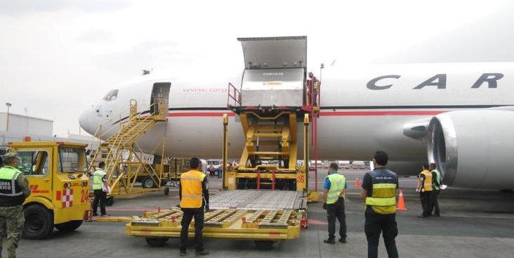 El vuelo W8952 de la aerolínea de Cargo Jet aterrizó en punto de las 10:00 horas, para trasladarse al punto de desembarque de los contenedores con el biológico.
