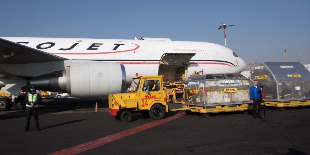 Un avión con 487 mil 500 vacunas de Pfizer-BioNTech para atender el Covid-19 aterrizó esta mañana en el Aeropuerto Internacional de la Ciudad de México (AICM).