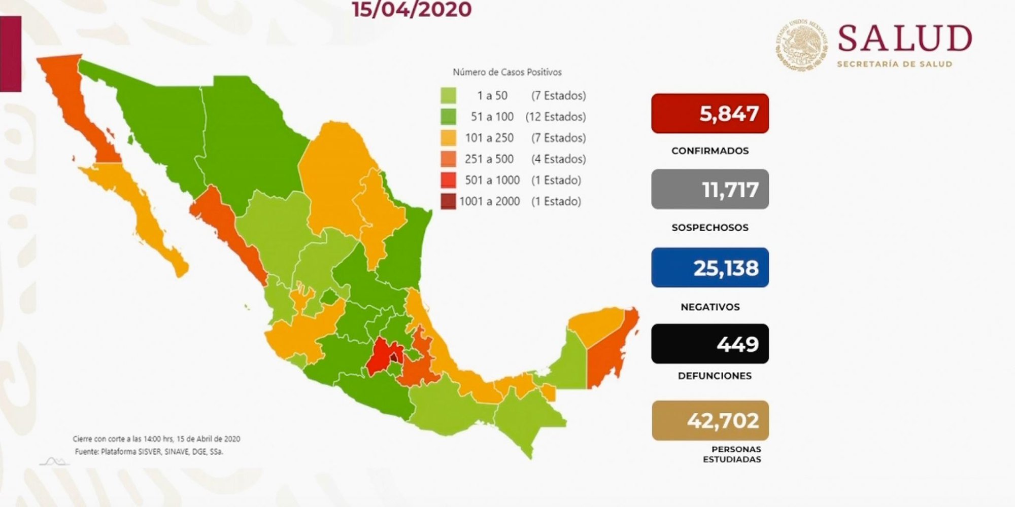 El subsecretario de la Secretaría de Salud federal (Ssa), Hugo López-Gatell, informó en conferencia de prensa que el número de casos confirmados de la nueva cepa de coronavirus Covid-19 aumentó a 5,847 en México.