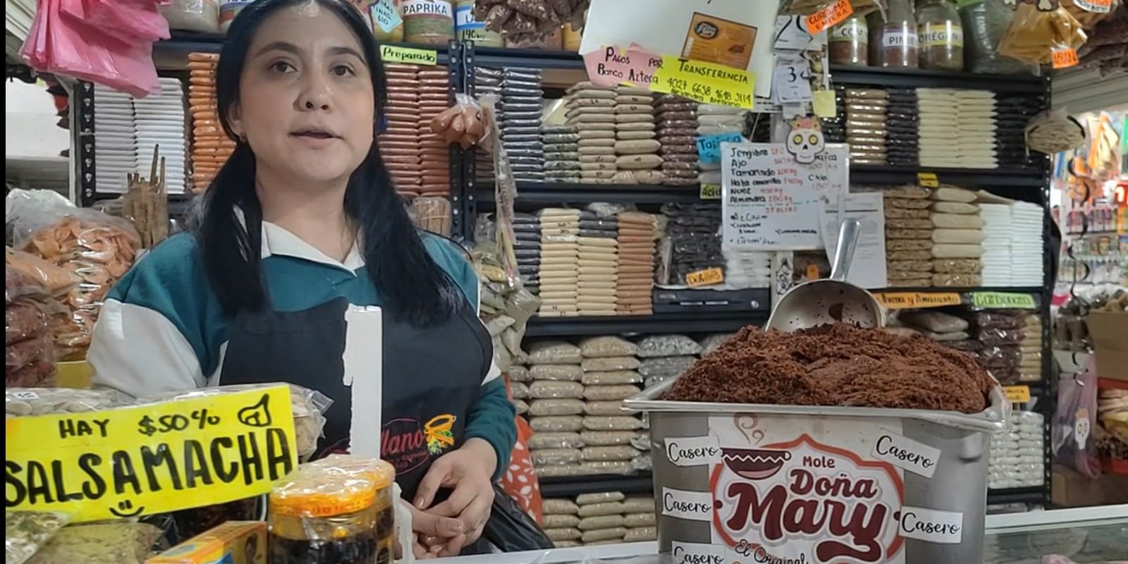La comerciante Mariana Xunaxi Ibarra Arellano explicó que el proceso inicia en casa, donde se tuestan granos, semillas y chiles cascabel, además de limpiarlos y secarlos antes de molerlos. Este trabajo previo permite que el consumidor solo necesite mezclarlo con caldo o agua y freírlo durante unos 15 minutos para tener el platillo listo.