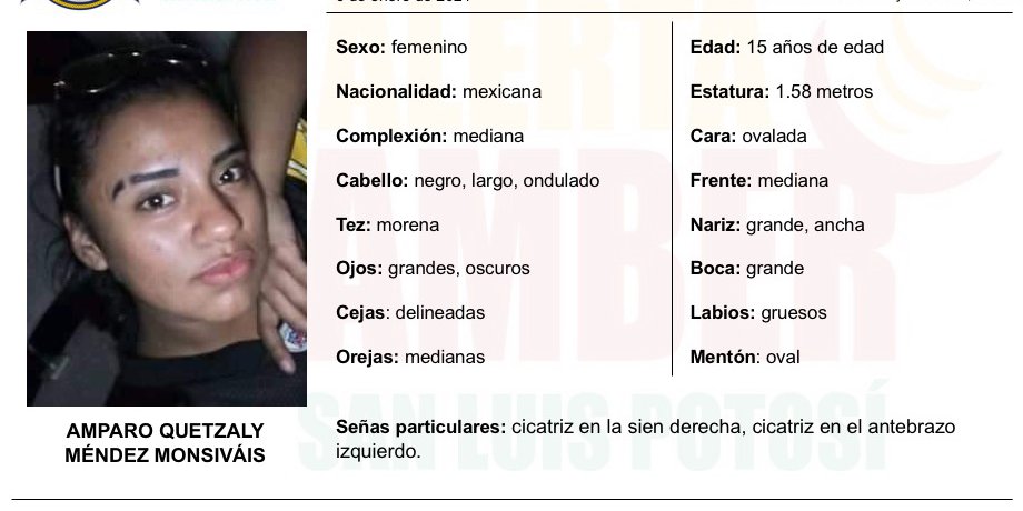 CERRITOS- La Fiscalía General del Estado de San Luis Potosí (FGESLP), activó una Alerta Amber para localizar a una menor de 15 años de edad, de nombre Amparo Quetzaly Méndez Monsiváis, quien fue vista por última vez en el tramo ferroviario que se localizan en el municipio de Cerritos y Rioverde en San Luis Potosí, cerca de una cementera.