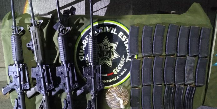 En el lugar se aseguraron cuatro armas de fuego largas calibre 5.56 milímetros, tres armas de fuego cortas, 408 cartuchos útiles calibre 5.56 milímetros, 22 cargadores, ocho placas balísticas, dos chalecos tácticos, cinco radios de comunicación, así como 20 dosis de sustancia granulada con características similares al “cristal”, además de camioneta color blanco.