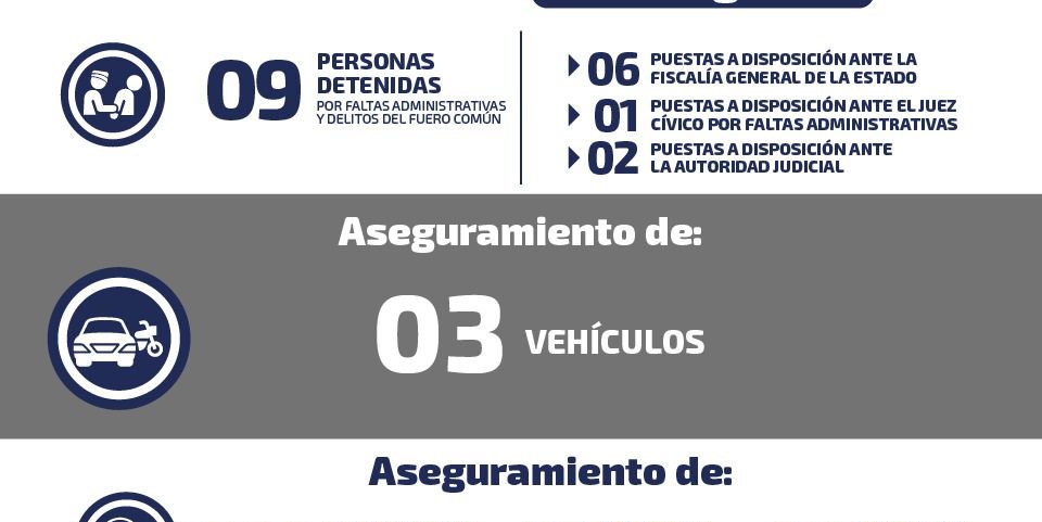 La Mesa Estatal para la Construcción de la Paz, conformada por las diversas corporaciones de seguridad y procuración de justicia en la entidad, detalló la detención de 9 personas por delitos y faltas administrativas; especificaron que 6 fueron puestas a disposición de la Fiscalía General del Estado, una puesta a disposición ante el juez cívico y 2 presentados ante el ente judicial.