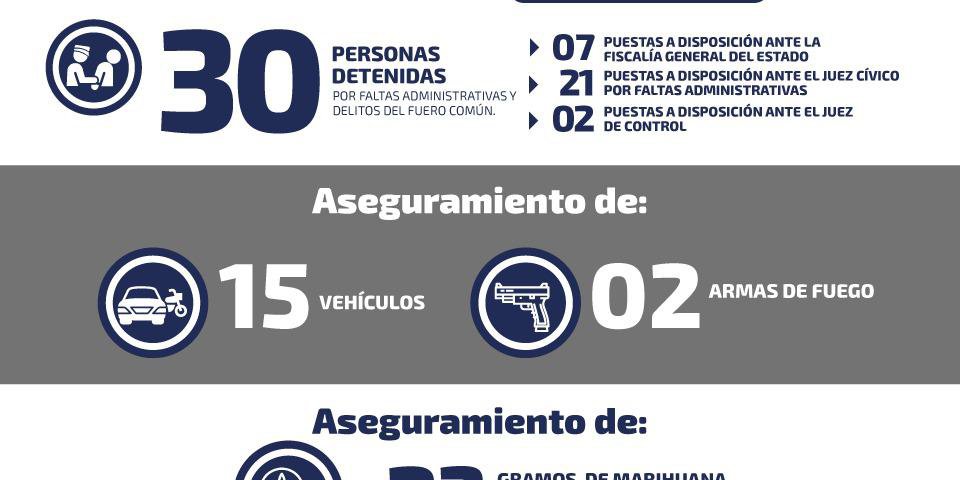 Se detalla además que se consolidó la localización de 8 vehículos con reporte de robo, así como 7 unidades que no tenían dicho registro. También se aseguraron 23 gramos de marihuana y dos armas de fuego tipo artesanales.