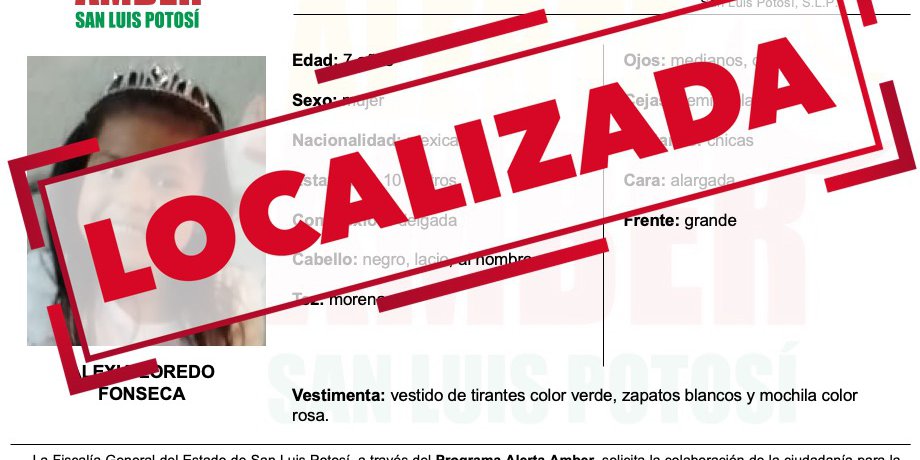 SLP. - Fue localizada la menor de 7 años de edad, por la que la Fiscalía General del Estado (FGE) emitió una Alerta Amber, el 1 de mayo del 2022.