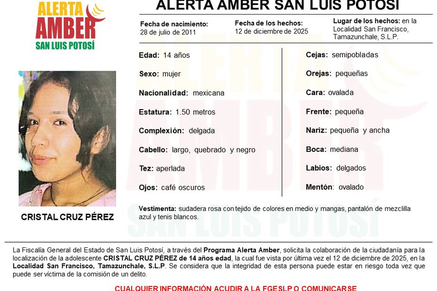 Fiscalía activó Alerta Amber para la búsqueda de una adolescente de 14 años en la Huasteca Potosina