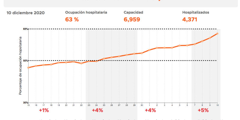 Según cifras del gobierno local, el 24 de noviembre se llegó al 50% de ocupación hospitalaria y había 3,455 pacientes ingresados. Desde entonces la ocupación ha ido en aumento, en 16 días llegó a 63%.