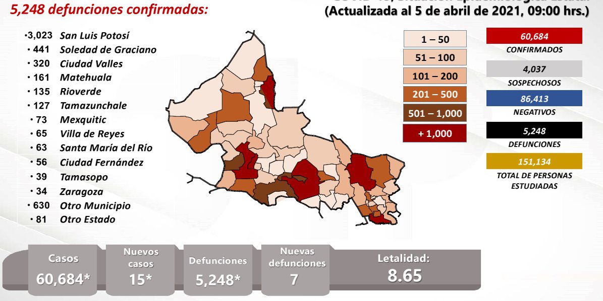 Se explicó que las 7 defunciones presentadas corresponden a 4 hombres y 3 mujeres; de los que 3 tenían residencia en la capital, uno en Ciudad Valles, Guadalcázar, Ciudad Valles, Axtla de Terrazas y Xilitla, respectivamente, y presentaban morbilidades de hipertensión arterial (4), edad (6), diabetes (4) y obesidad (1).