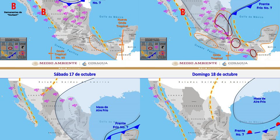 Para hoy viernes, se pronostica que, el frente No. 7 se extenderá con características de estacionario desde el norte del Golfo de México hasta el oriente del país, interaccionará gradualmente con un canal de baja presión sobre el occidente y suroeste del Golfo de México, condición que incrementará el potencial de lluvias puntuales intensas en Tamaulipas, San Luis Potosí, Puebla, Veracruz, Tabasco y Chiapas.