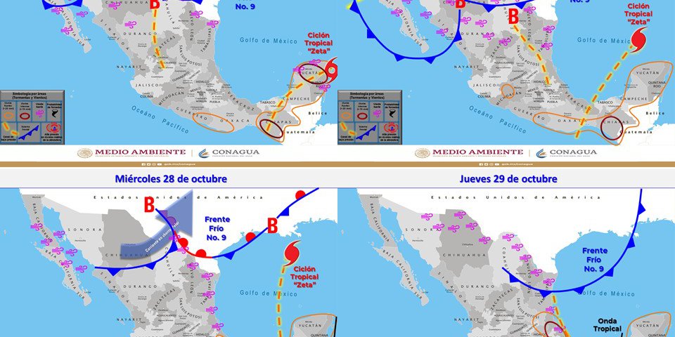 El martes y miércoles, el ciclón tropical Zeta se desplazará sobre el Golfo de México con trayectoria hacia el sureste de Estados Unidos, continuará asociado con un canal de baja presión extendido sobre el sureste del país, provocando lluvias fuertes a puntuales intensas en dicha región.