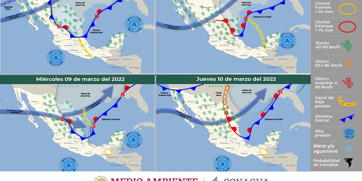 El jueves, un nuevo frente frío se aproximará al noroeste de México, provocando rachas fuertes de viento en dicha región.