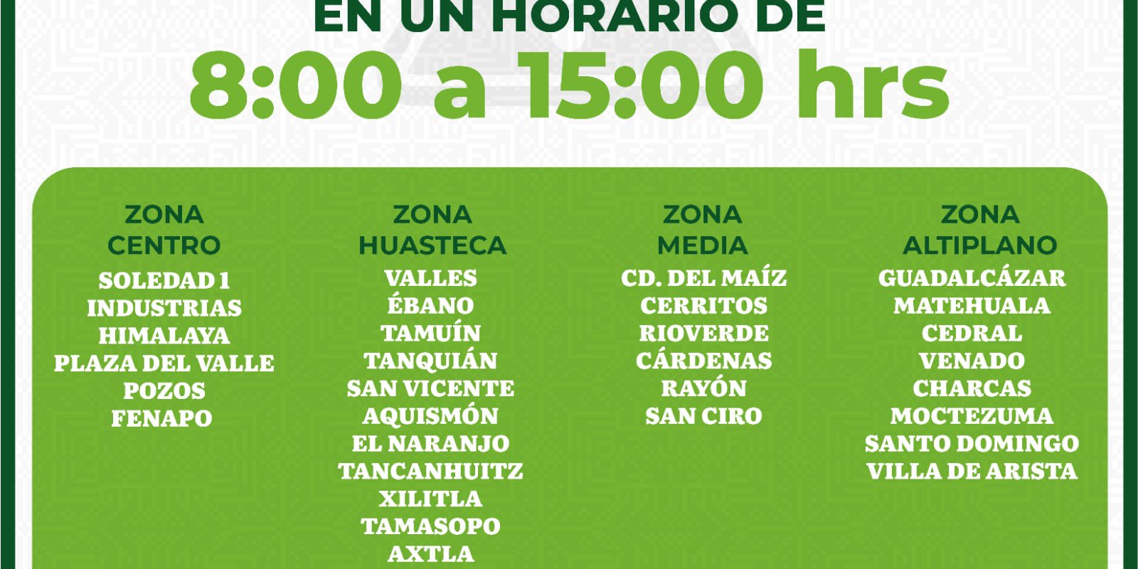Detalló que en la zona metropolitana brindarán servicios las oficinas de Soledad 1, Industrias, Himalaya, Plaza del Valle, Pozos y Fenapo; en la Huasteca: Ciudad Valles, Ébano, Tamuín, Tanquián, San Vicente, Aquismón, El Naranjo, Tancanhuitz, Xilitla, Tamasopo, Axtla de Terrazas y Tamazunchale; en la región Media brindará servicio las oficinas de Ciudad del Maíz, Cerritos, Rioverde, Cárdenas, Rayón, San Ciro de Acosta y en el Altiplano las de Guadalcázar, Matehuala, Cedral, Venado, Charcas, Moctezuma, Santo Domingo y Villa de Arista.