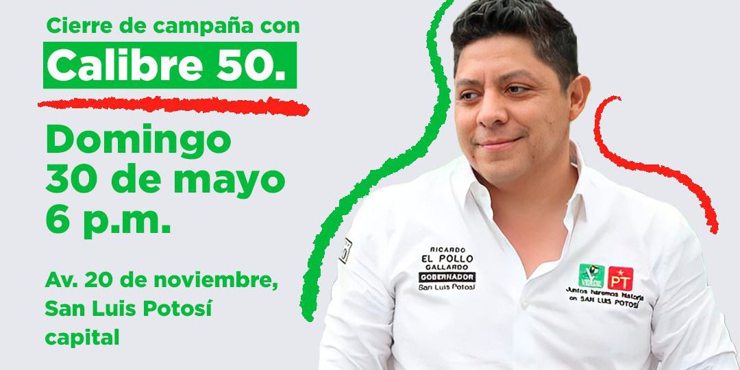 José Ricardo Gallardo Cardona invitó a los potosinos al cierre de campaña que realizará este domingo 30 de mayo en la Avenida 20 de Noviembre a partir de las 18 horas con la agrupación “Calibre .50”, evento en el que estará acompañado por Leonel Serrato Sánchez, candidato a la Alcaldía capitalina.