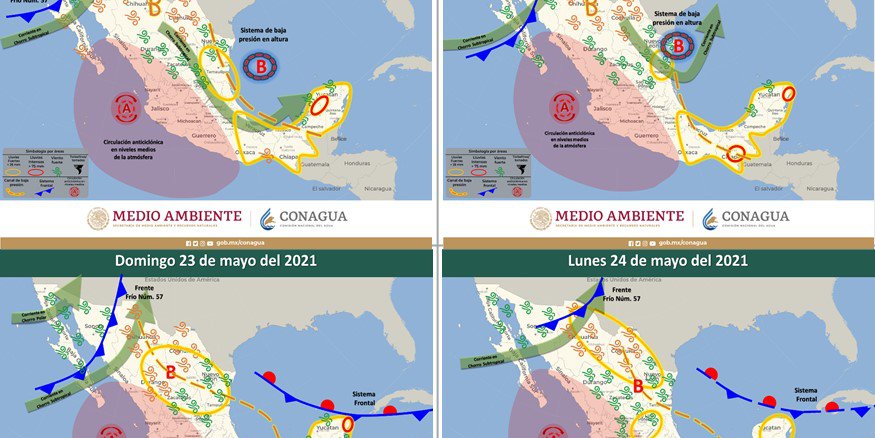 Un canal de baja presión en interacción con un sistema de baja presión en niveles altos de la atmósfera ubicado en el Golfo de México y con divergencia en altura, ocasionará lluvias fuertes a puntuales intensas acompañadas de descargas eléctricas, fuertes ráfagas de viento y posibles granizadas sobre entidades del sureste de la República Mexicana y Península de Yucatán, así como chubascos y lluvias fuertes en el noreste, oriente y centro del territorio nacional.