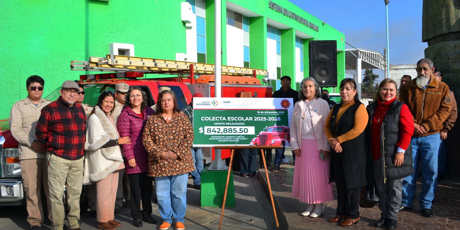 El Sistema Educativo Estatal Regular (SEER) refrendó su compromiso social con la entrega de más de 842 mil pesos en apoyo al Heroico Cuerpo de Bomberos como parte de la Colecta Escolar 2025–2026, resultado de la participación responsable de directivos, personal administrativo, docentes, alumnas y alumnos de diversas instituciones educativas.
