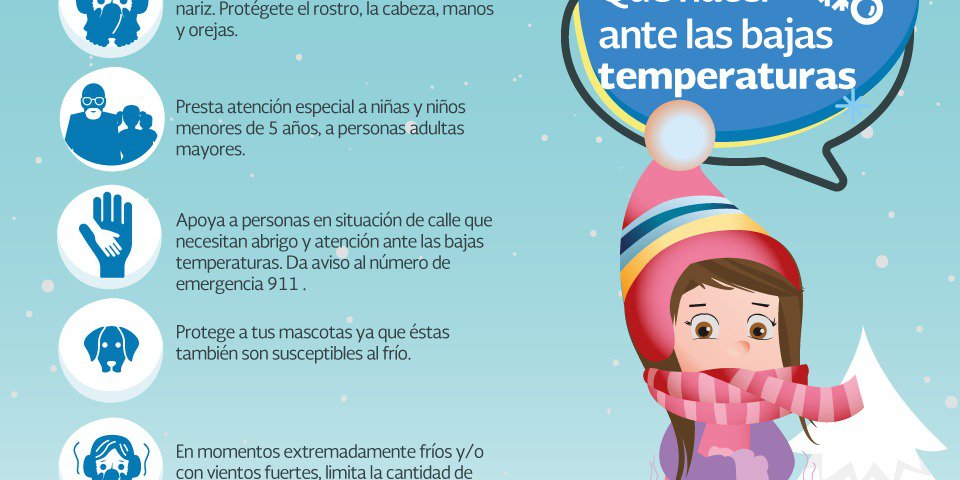 El funcionario pidió a la población tomar en cuenta algunas recomendaciones para evitar enfermedades y accidentes tales como no usar anafres en espacios cerrados, revisar los calentadores tanto de gas como eléctricos antes de usarlos, taparse boca y nariz al pasar de un ambiente cálido a uno frío y tener especial cuidado con menores de 6 años, personas adultas mayores de 65 y personas con enfermedades respiratorias crónicas.