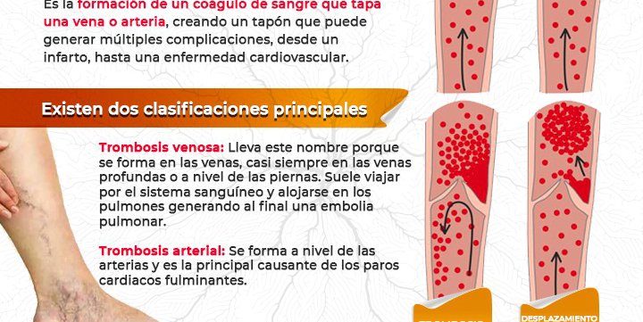 Actualmente, se conocen dos tipos de trombosis, la venosa y la arterial, la primera se forma en las venas, casi siempre en las venas profundas o a nivel de las piernas. Suele viajar por el sistema sanguíneo y alojarse en los pulmones generando al final una embolia pulmonar. Y la Trombosis Arterial, a diferencia de la anterior esta se forma a nivel de las arterias y es la principal causante de los paros cardíacos fulminantes.