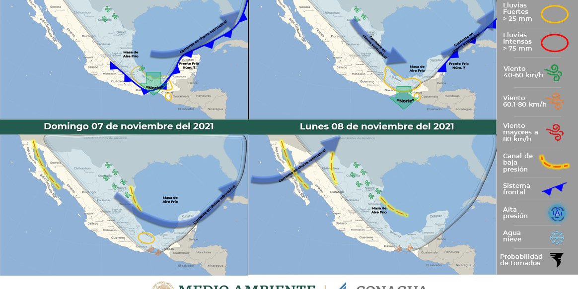 Para hoy, el frente frío Núm. 7 se desplazará sobre el sureste de México y posteriormente sobre la Península de Yucatán y ocasionará lluvias puntuales muy fuertes en el oriente y sureste del territorio nacional, así como intervalos de chubascos en el sur del litoral del Pacífico y la Península de Yucatán.
