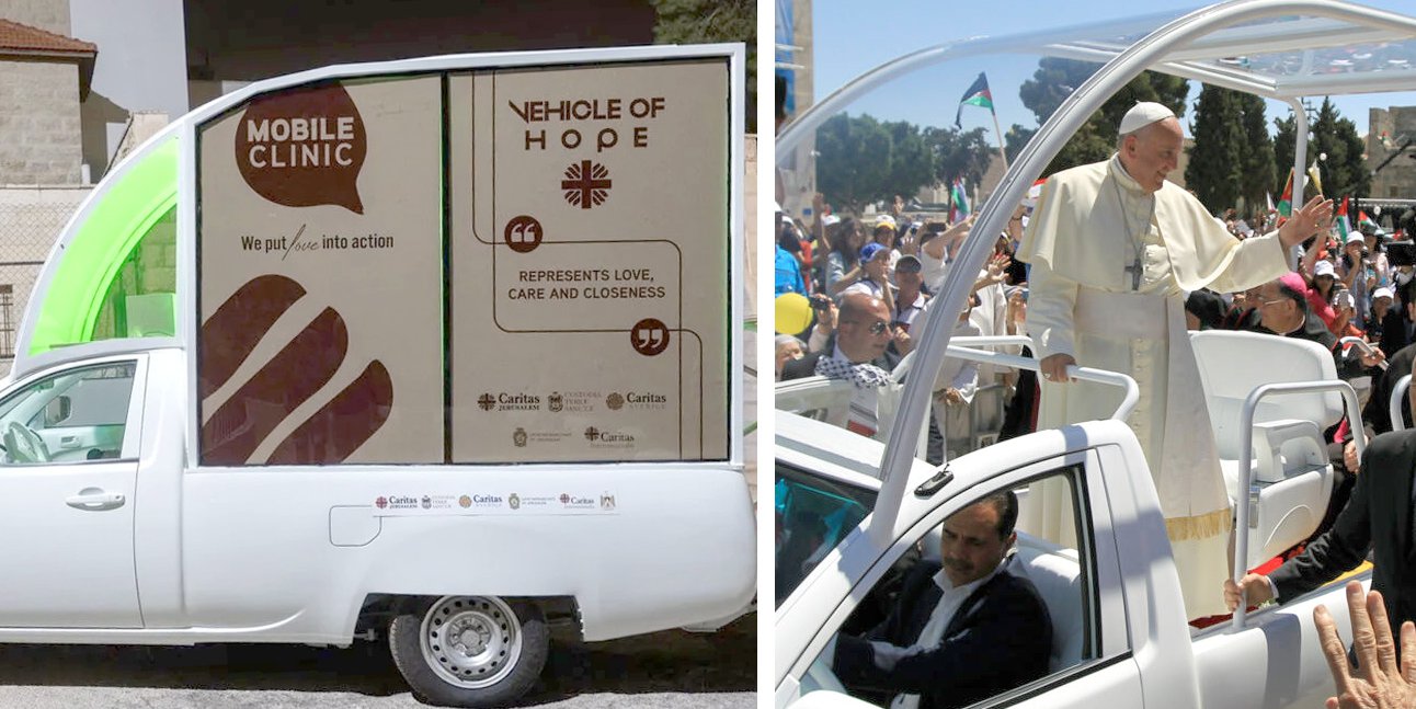 El vehículo todavía conserva el aspecto inconfundible de un papamóvil, pero ahora, en lugar de transportar al líder de los 1,400 millones de católicos que hay en el mundo, fue rebautizado como el "vehículo de la esperanza" para atender a los niños de Gaza, cumpliendo con los deseos del fallecido pontífice argentino.
