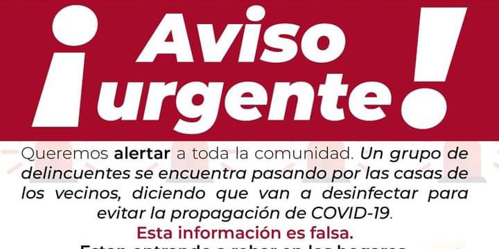 Señala que un grupo de delincuentes se encuentra pasando por las casas de los vecinos, diciendo que van a desinfectar para evitar la propagación del Covid, información que es falsa, ya que dichas personas ingresan a los domicilios para robar.