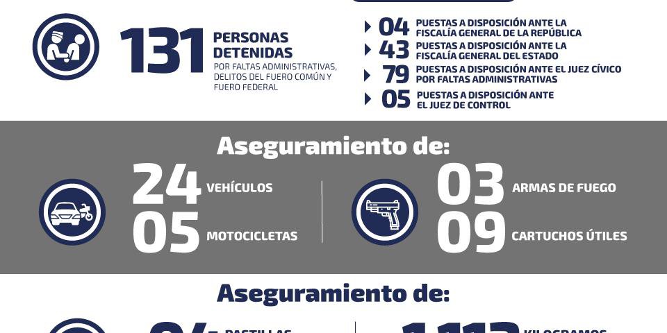 San Luis Potosí.- Durante operativos de seguridad el fin de semana correspondiente del tres al cinco de julio, la Mesa de Coordinación Estatal para la Construcción de la Paz (MCEPCP), informó que fueron detenidas un total de 131 personas por diversos delitos y faltas administrativas, de los cuales, 18 se dedicaban al narcomenudeo, asimismo, fueron aseguradas tres armas de diferentes calibres y nueve cartuchos útiles.