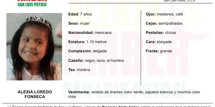 SLP. – La Fiscalía General del Estado de San Luis Potosí (FGESLP), activó una Alerta Amber para la localización de una menor de 7 años de edad, de nombre Alexia Loredo Fonseca, quien fue vista por última vez en el fraccionamiento Praderas del Real en la ciudad Capital.