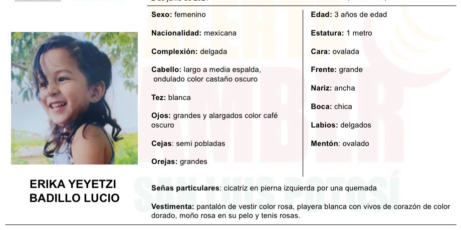 SLP. – La Fiscalía General del Estado de San Luis Potosí (FGESLP), activó una Alerta Amber, para la localización de una menor de tres años de edad, de nombre Erika Yeyetzi Badillo Lucio quien fue vista por última vez en la colonia Providencia del municipio de Matehuala.