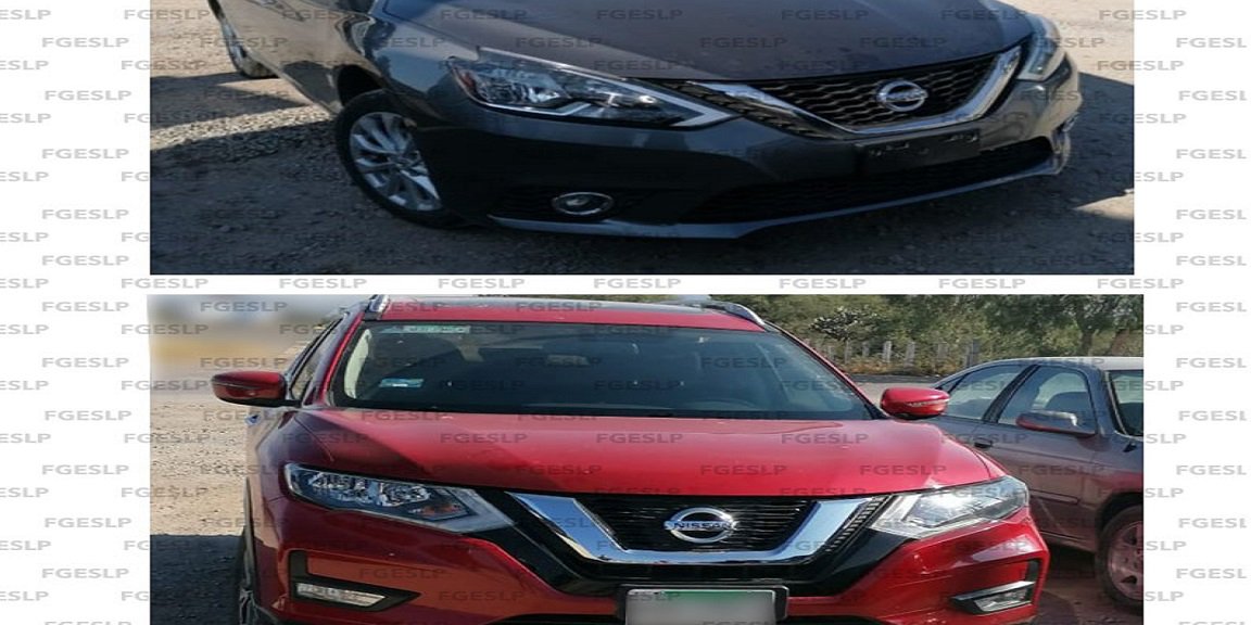 Se trata de un vehículo Nissan, tipo X-Trail, color rojo, con placas del estado de San Luis Potosí, así como también un sedán, Sentra, modelo 2019, color gris.