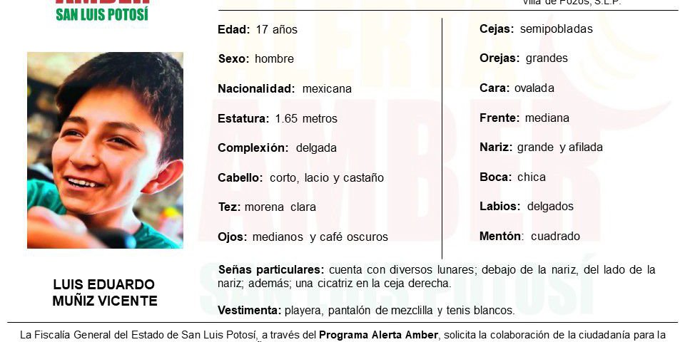 La Fiscalía General del Estado de San Luis Potosí (FGESLP) activó una ficha de Alerta Amber para la localización de Luis Eduardo Muñiz Vicente, quien tuvo contacto por última vez con sus familiares el 14 de noviembre de 2025, en la comunidad Laguna de Santa Rita de Villa de Pozos.