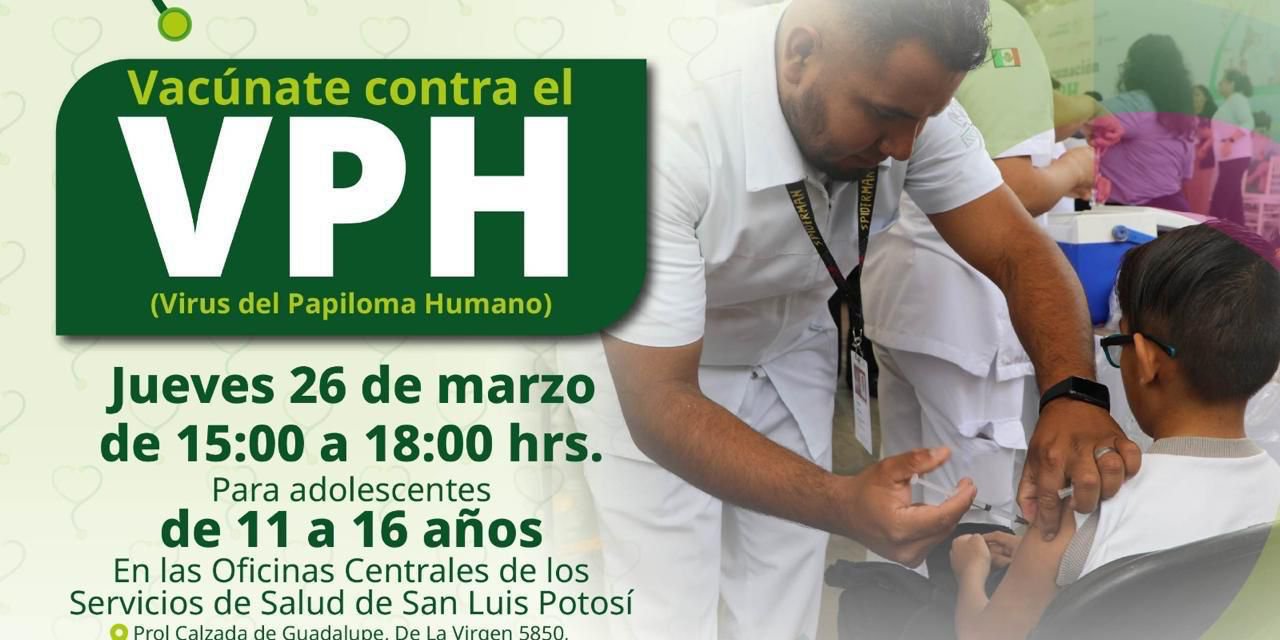 Siguiendo la instrucción del Gobernador Ricardo Gallardo Cardona de fortalecer la salud preventiva, los Servicios de Salud realizarán una jornada de vacunación contra el Virus del Papiloma Humano (VPH) el 26 de marzo, en un horario de 15:00 a 18:00 horas, en las oficinas centrales de la dependencia, con el respaldo del programa Visitando Corazones y un trabajo sin límites en favor de las juventudes.
