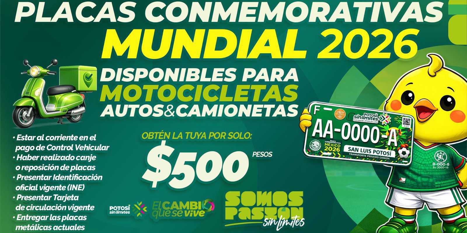 Como parte del impulso sin límites del Gobernador Ricardo Gallardo Cardona a servicios más modernos y cercanos, la Secretaría de Finanzas (Sefin) puso a disposición las placas mundialistas para motocicletas en las oficinas recaudadoras de las cuatro regiones, con un esquema para ofrecer opciones innovadoras a las y los contribuyentes.